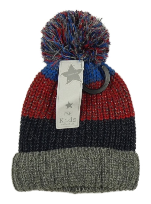 Nové - šedo-tmavomodro-červeno-modrá melírovaná pletená čepice s bambulí F&F