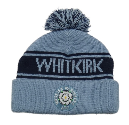 Modrá čepice s tmavomodrým pruhem a nášivkou a bambulí