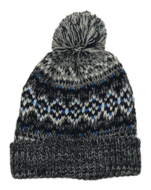Šedo-černo-modrá vzorovaná pletená čepice s bambulí