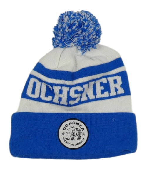 Modro-bílá čepice s nášivkou a bambulí
