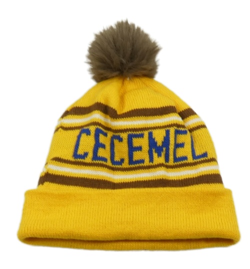 Žlutá pletená čepice s nápisem a bambulí