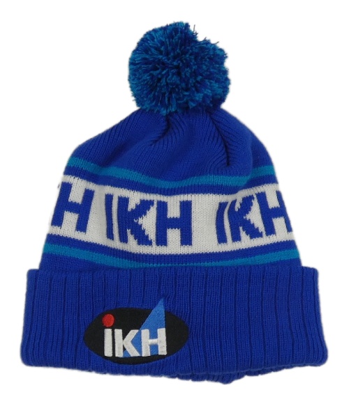 Tmavomodro-bílá čepice s nápisy a bambulí