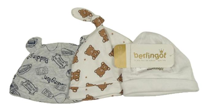 3x bavlněná čepice - šedá melírovaná s obrázky - Paddington + bílá s medvědy + bílá s nápisem