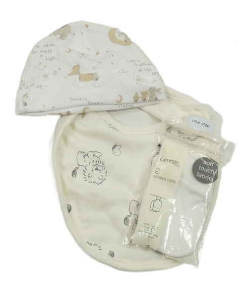 4set - Bílá žebrovaná čepice se zvířaty + smetanový slinták s lvíčky + 2x bílé rukavičky