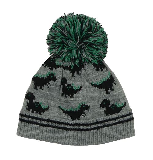 Šedá melírovaná pletená zateplená čepice s dinosaury a pruhy a bambulí F&F