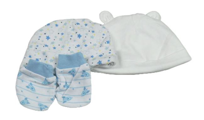 3Set - 2x - Bílá čepice - s hvězdičkami, s oušky F&F + bílo/světlemodré rukavice s raketami