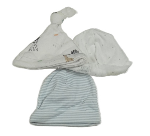 2x bavlněná čepice bílá s hvězdičkami+ bílá se zvířátky+ pruhovaná