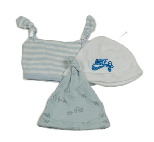 3x bavlněná čepice bílá s logem+ modrá se slony+ pruhovaná