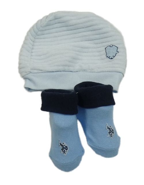 2set- světlemodrá pruhovaná sametová čepice s nášivkou+ modré ponožky