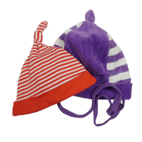 2x čepice - červeno-bílá pruhovaná bavlněná + fialovo-bílá sametová s pruhy