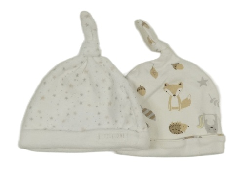 2x čepice - bílá s hvězdičkami + bílá se zvířaty