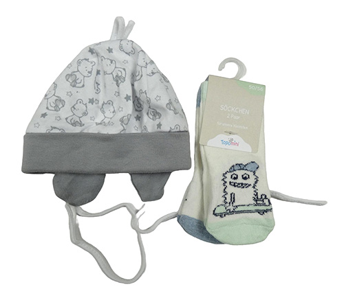 3set - Bílá bavlněná čepice s medvědy + 2x smetanové ponožky s příšerkou