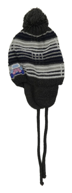 Šedo-tmavomodro-bílá pruhovaná čepice s autem a bambulí