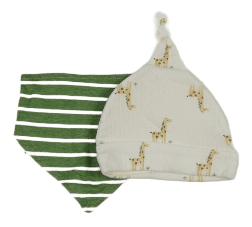 2set- bílá čepice se žirafami+ zelený pruhovaný slinták
