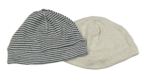 2x bavlněná čepice - šedo-černá pruhovaná + béžová
