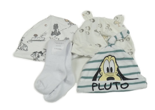 4set- bílá pruhovaná čepice s Plutem+ bílá s ježky+ bílá s obrázky+ bílé ponožky