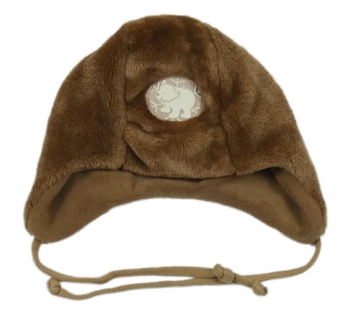 Hnědá plyšová zateplená zavazovací čepice s medvídkem