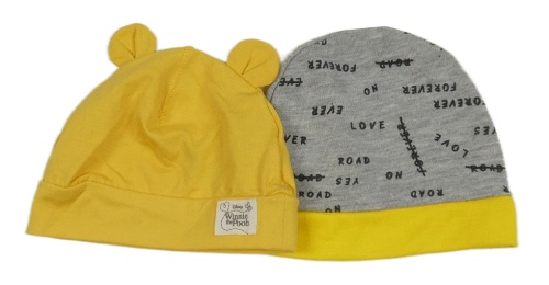 2x čepice - žlutá s oušky + šedá s nápisy a žlutým lemem