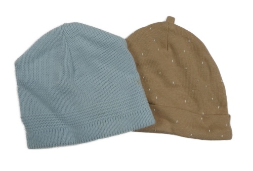 2x - Světlemodrá pletená + béžová bavlněná čepice s puntíky