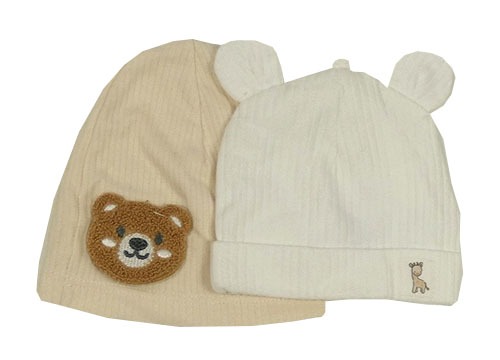 2x žebrovaná bavlněná čepice - bílá s oušky + béžová s medvědem