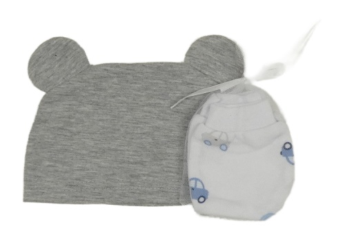 2set - Šedá čepice s ušima + bílé rukavice s auty