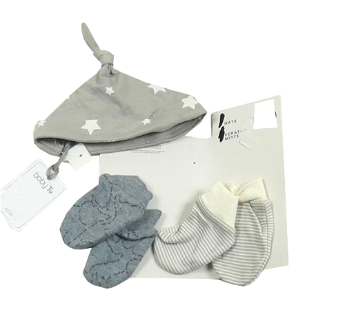 3set - Šedá bavlněná čepice s hvězdami + modré melírované rukavičky s nápisy + šedo-bílé pruhované