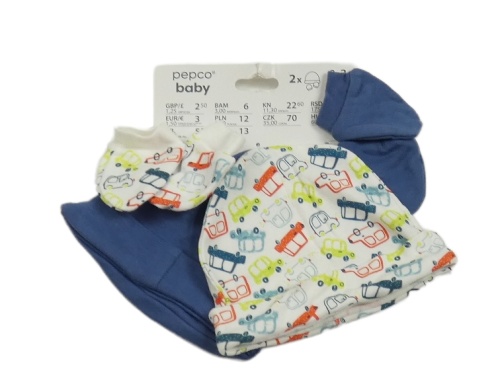 Nové - 4set - Bílá bavlněná čepice s auty + tmavomodrá + 2x rukavičky Pep&Co