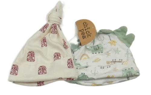 2x bavlněná čepice - bílá s dinosaury + smetanová s obrázky