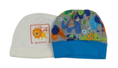 2x bavlněná čepice - modrá se slony + bílá s lvem