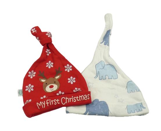 2x bavlněná čepice - smetanová se slony + červená se sobem a vločkami