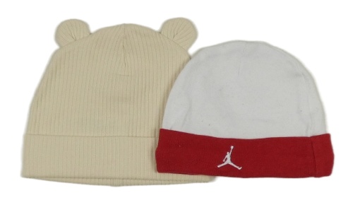 2x čepice - smetanová žebrovaná + bílo-červená s výšivkou