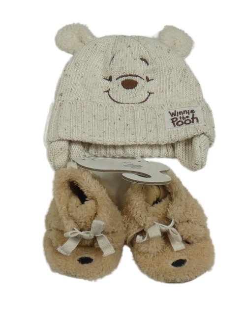 Nové - 2set - Světlebéžová melírovaná čepice - Pú + béžové chlupaté capáčky s čumákem vel. 17