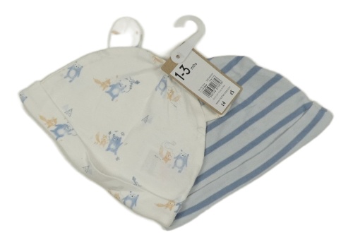 Nové - 2x - Bílá s medvídky + světlemodro-modrá pruhovaná bavlněná čepice Mothercare