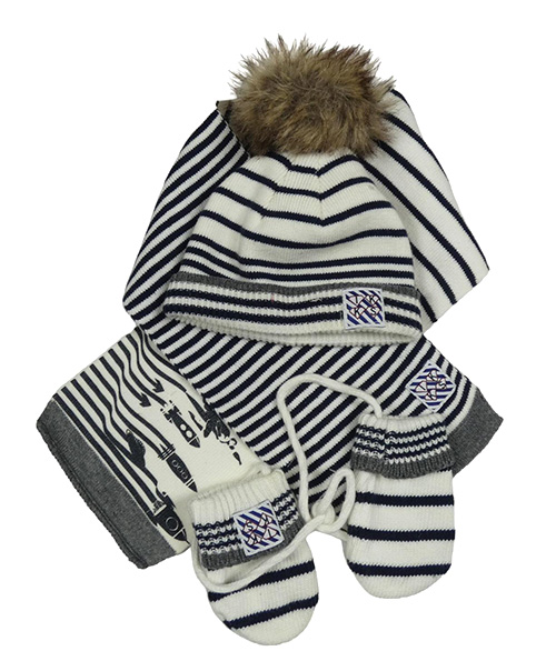 3set - Smetanovo-černá pruhovaná čepice s bambulí + pruhovaná šála s raketami + rukavice na šňůře