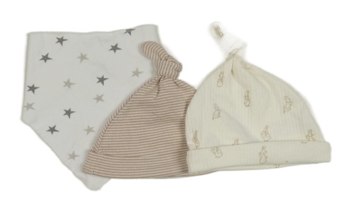 3set - Smetanová žebrovaná čepice s Peter Rabbit + hnědo-bílá pruhovaná + bílý slinták s hvězdami