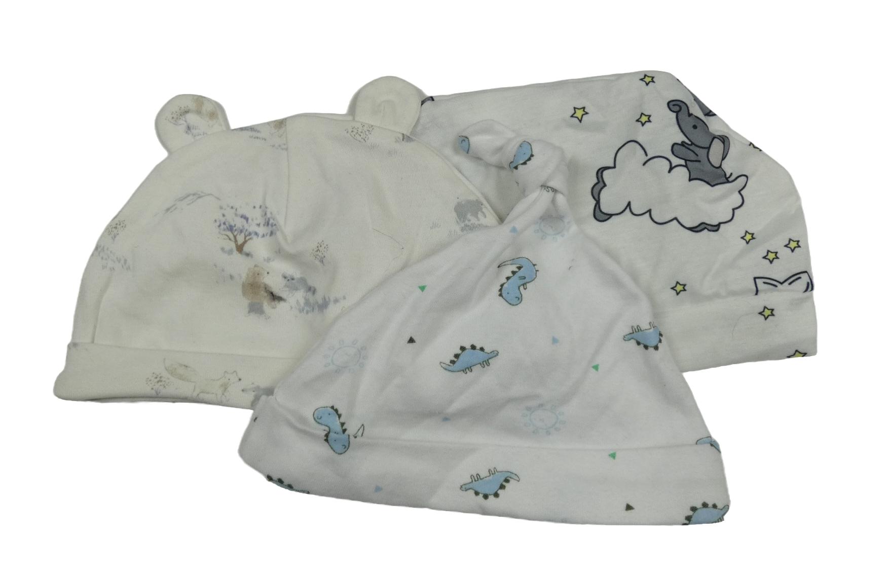 3x čepice - bílá s dinosaury + bílá se slony + smetanová s obrázky