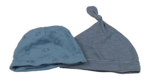 2x bavlněná čepice - modrošedá s raketami + tmavomodro-modrá pruhovaná