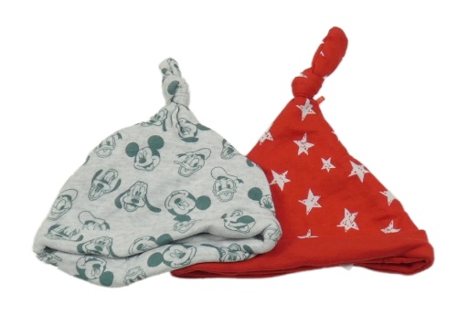 2x bavlněná čepice - červená s hvězdami + světlešedá melírovaná s Mickeym a přáteli