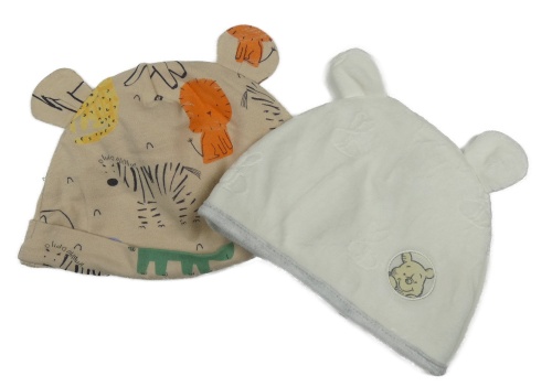 2x čepice - světlehnědá bavlněná čepice se zvířaty + bílá sametová s Púem