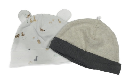 2x bavlněná čepice - bílá se zvířaty + béžová melírovaná