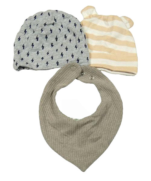 3set - Šedá melírovaná bavlněná čepice s blesky + béžovo-bílá pruhovaná s oušky + hnědý žebrovaný slinták