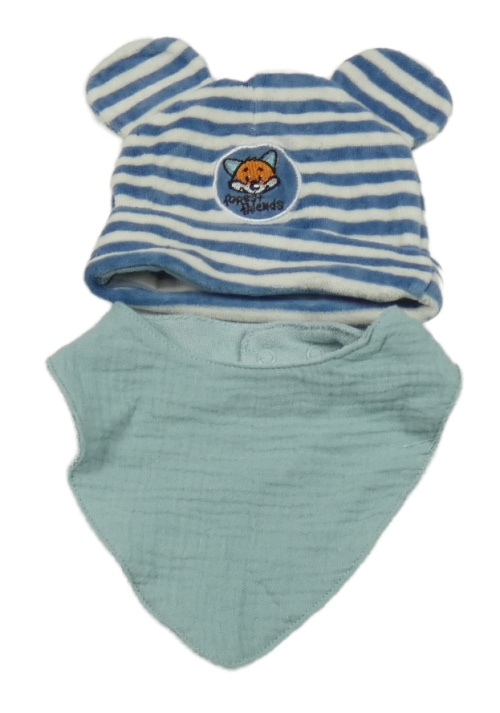 2set- modro-bílá pruhovaná sametová čepice s liškou+ modrý slinták