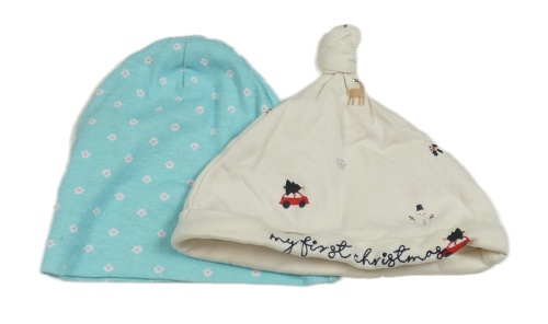 2x bavlněná čepice smetanová s obrázky+ modrá květinová