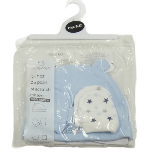 Nové - 4set - Světlemodrá bavlněná čepice + bílá s hvězdami + 2x rukavičky Early Days