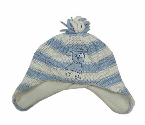 Světlemodro-bílá pruhovaná čepice se psem a třásněmi Next