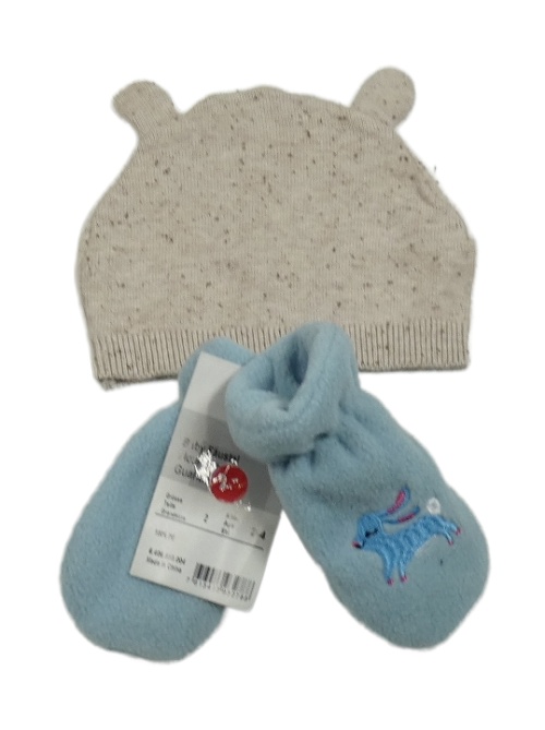 Nové - 2set - Béžová melírovaná čepice s oušky + světlemodré fleecové zimní rukavice s králíčky