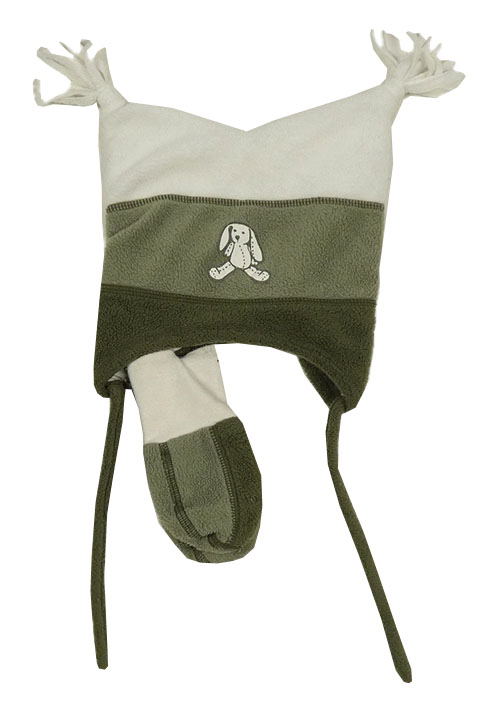 Nové - 2set - Khaki-bílá fleecová čepice se zajícem a třásněmi + rukavice