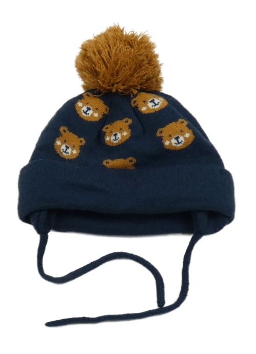 Tmavomodrá pletená zateplená čepice s medvědy a bambulí