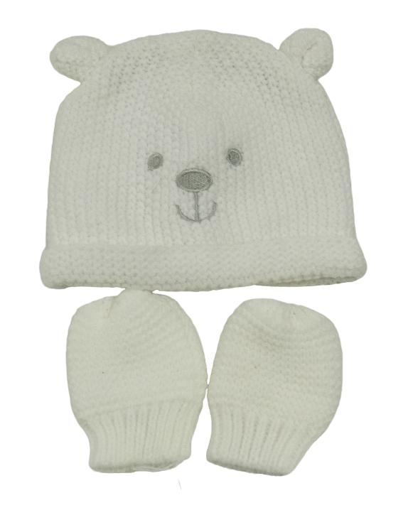 2 set - bílá pletená čepice - medvěd + pletené rukavice George