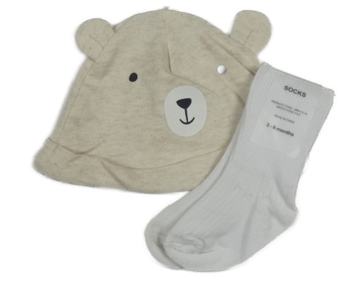 2set - Béžová melírovaná bavlněná čepice s medvědem + bílé ponožky